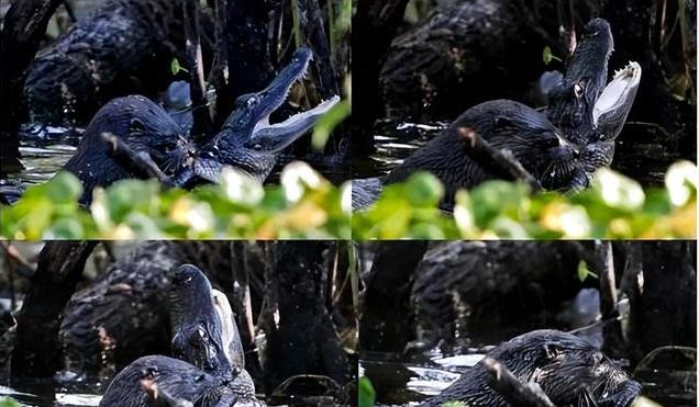 在被激怒时,它们表现出极强的攻击性。最终,水獭们凭借着团结和勇敢,成功地将鳄鱼赶走。